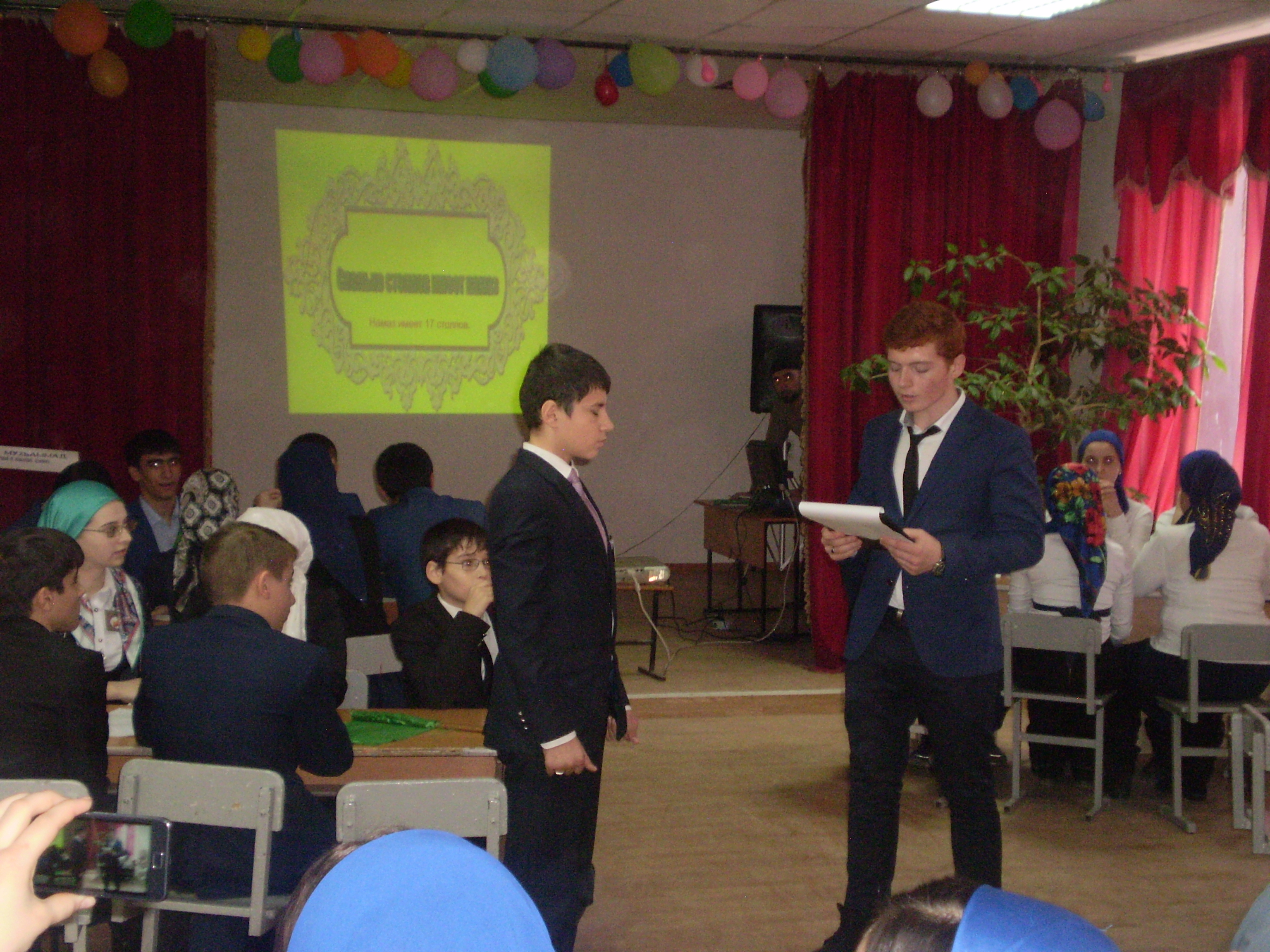 МБОУ «СОШ №1 с.п. Знаменское»: «Самое лучшее и прекрасное создание из творений Всевышнего Аллаха»- расширенная беседа ко Дню рождения Пророка Мухаммада(да благословит Его Всевышний и приветствует)22 декабря 2014 года в МБОУ «СОШ №1 с.п.Знаменское» было проведено открытое мероприятие среди учащихся 9-11-х классов, посвященное Дню рождения Пророка Мухаммада(да благословит Его Всевышний и приветствует)На мероприятии присутствовали: имам села Берсаев А.С и зам. имама Аюбов М.Х., администрация школы, педагог дополнительного образования Элиханов М.А., организатор Асхабова М.В., классные руководители 9-11-х классов.Основные цели мероприятия: духовно- нравственное воспитание учащихся, знакомство с жизнью и наследием Пророка Мухаммада (да благословит Его Всевышний и приветствует), воспитание учащихся на достоинствах Пророка Мухаммада, мусульманской нравственности и праведном поведении, знакомства с основными положениями мусульманской религии, воспитание толерантности, человеколюбия, гуманности .Мероприятие началось с выступления имама села Берсаева А.С., который рассказал о жизни Пророка (да благословит Его Всевышний и приветствует), Его пророческой миссии, о Коране. Он сделал акцент на том, что вера в единого Всевышнего является основой жизни каждого из нас. Мы, мусульмане, должны изо всех сил поддерживать Ислам, сохранять все накопленные знания, передавать их своим потомкам, следовать всем законам, предписанных нам Всевышним.Педагог дополнительного образования Элиханов М.А. для закрепления сказанного присутствующими на мероприятии духовными наставниками, организовал игру-викторину «Знаем ли мы Ислам». В процессе игры ребята проявили себя хорошими знатоками основ Ислама, знатоками семейного паспорта Пророка Мухаммада (да благословит Его Всевышний и приветствует). Итоги мероприятия подвел директор школы Магдаев А.М.. Он отметил, что каждый из нас обязан как можно больше знать о своей религии, делиться знаниями о ней, наставлять заблудших на истинный путь. Ислам идеален! Наша задача показать людям на сколько он совершенен и чист. И каждый из нас об этом должен помнить.