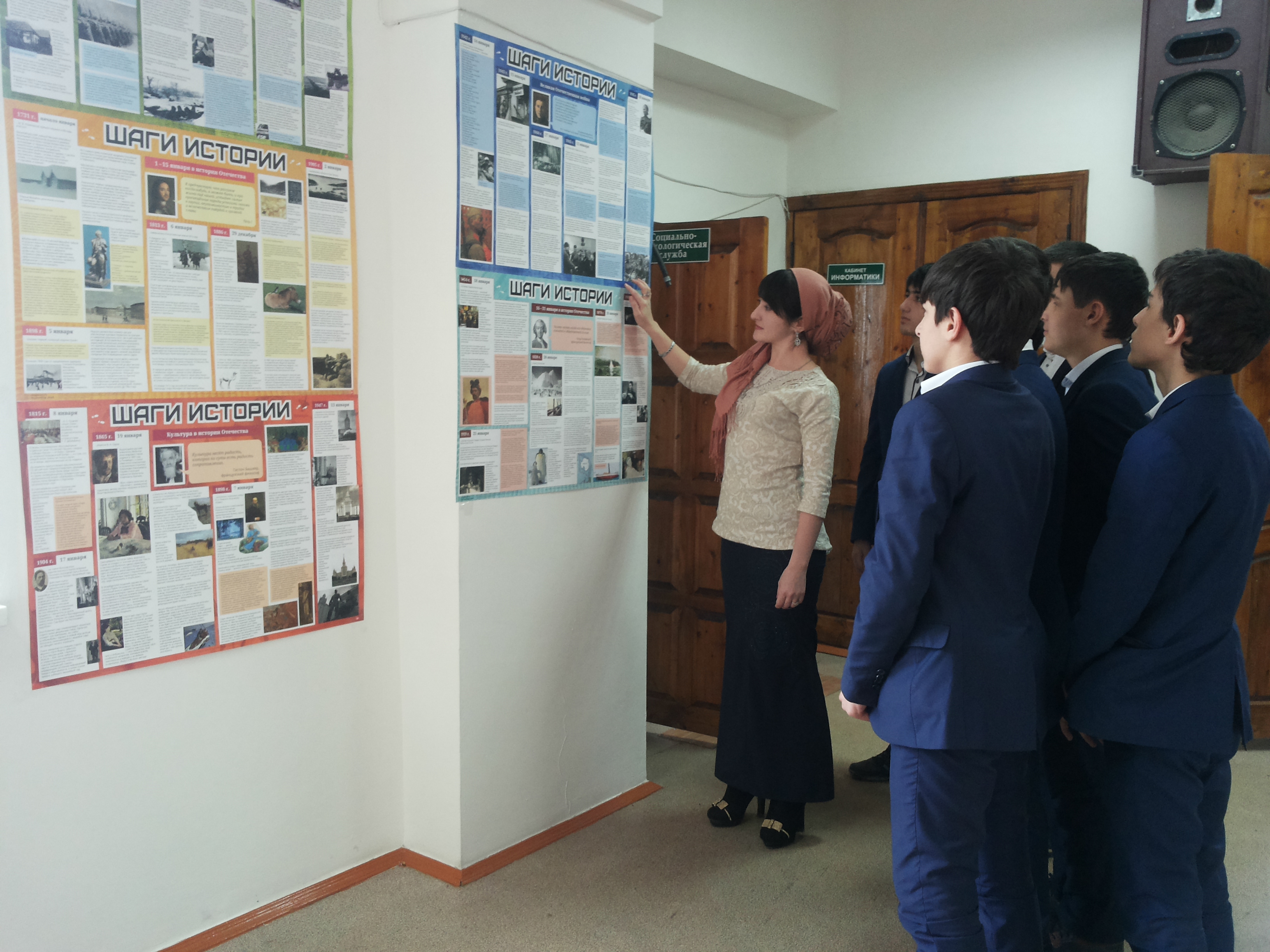 01.02.2016 г. в МБОУ « СОШ№1 с.п.Знаменское» Надтеречного района прошла республиканская акция в рамках работы клуба Юные Кадыровцы «Шаги истории» Учителя - предметники рассказывали детям о подвигах солдат Великой Отечественной Войны, начиная с ноября и кончая январём 1941-1945-х годов. Они затронули следующие темы:- о гражданском и научном подвиге М.В Ломоносова;- о первом полярном ледоколе « Ермак»;- об исследователе природы Центральной Азии Н.М. Пржевальском;- о завершении обороны Порт-Артура на границах с Китаем в конце 19 века;- об учебе великого русского поэта А.С. Пушкина в Царскосельском лицее;- о выдающемся русском живописце В.А. Серове;- о Московском художественном театре , где впервые была показана последняя пьеса Чехова « Вишневый сад»- о премьере оперы Н.А. Римского-Корсакова « Садко»- о принятии постановления о строительстве в Москве высотных зданий;- об открытии Антарктиды;- об осуществлении первой стыковки космических кораблей с космонавтами на борту в открытом космосе; Были взяты именно те исторические события истории Российского Государства, которые проходили в январе месяце в XIII-XX в веках. Ребята с интересом и вниманием слушали рассказы учителей, задавали интересующие их вопросы. В воздухе царила атмосфера увлеченности и желания узнать ещё больше исторических фактов, связанных с рассказом учителя.