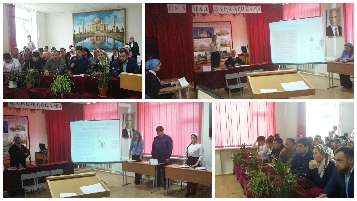 На мероприятии присутствовали: прокурор Надтеречного района Асабаев М.М., начальник РУО Муцулханов И.С., заместитель прокурора Балихаджиев З.Б., помощник прокурора Саказов У.А., имам мечети села Знаменское Берсаев А.С., ведущий специалист-эксперт отдела территориальных представителей Министерства ЧР по делам молодежи, руководитель филиала молодежного движения "Ахмат" Эдильсултанов М.С., заместитель руководителя филиала молодежного движения "Ахмат" Эльбуздукаев М.Т. На заседании суда над наркотиками присутствовали адвокат, государственный обвинитель, судья и секретарь, роли которых сыграли учащиеся 11-х классов, но в роли прокурора, участвуя в игре, был настоящий прокурор Надтеречного района Асабаев М.М. В зале была создана атмосфера настоящего судебного заседания: судья был в мантии, на столе кодексы законов РФ, молоток судьи, адвокат защищал обвиняемых, прокурор выдвигал обвинения, выступали свидетели, присяжные заседатели и психолог школы. В конце судебного заседания учащиеся показали сценки о неадекватном поведении наркоманов, прочитали стихотворение С.Никитина "Исповедь наркомана" и спели песни о счастливой жизни без наркотиков. В зале царила атмосфера взаимопонимания, всеобщего осуждения наркомании и других антиобщественных проявлений. В заключении мероприятия выступила директор школы Мударова М.А., которая сказала о важности проведения таких профилактических мероприятий. Она предоставила слово гостям, которые высказали свое мнение о мероприятии: о значимости мероприятия сказал начальник РУО Муцулханов И.С., о необходимости проводить профилактическую работу с молодежью систематически сказал прокурор района Асабаев М.М., о негативном отношении ислама к наркомании говорил имам села Берсаев А.С., Эдильсултанов М.С. поблагодарил за активное участие в мероприятии всех ребят, в том числе и членов клуба "Ахмат"