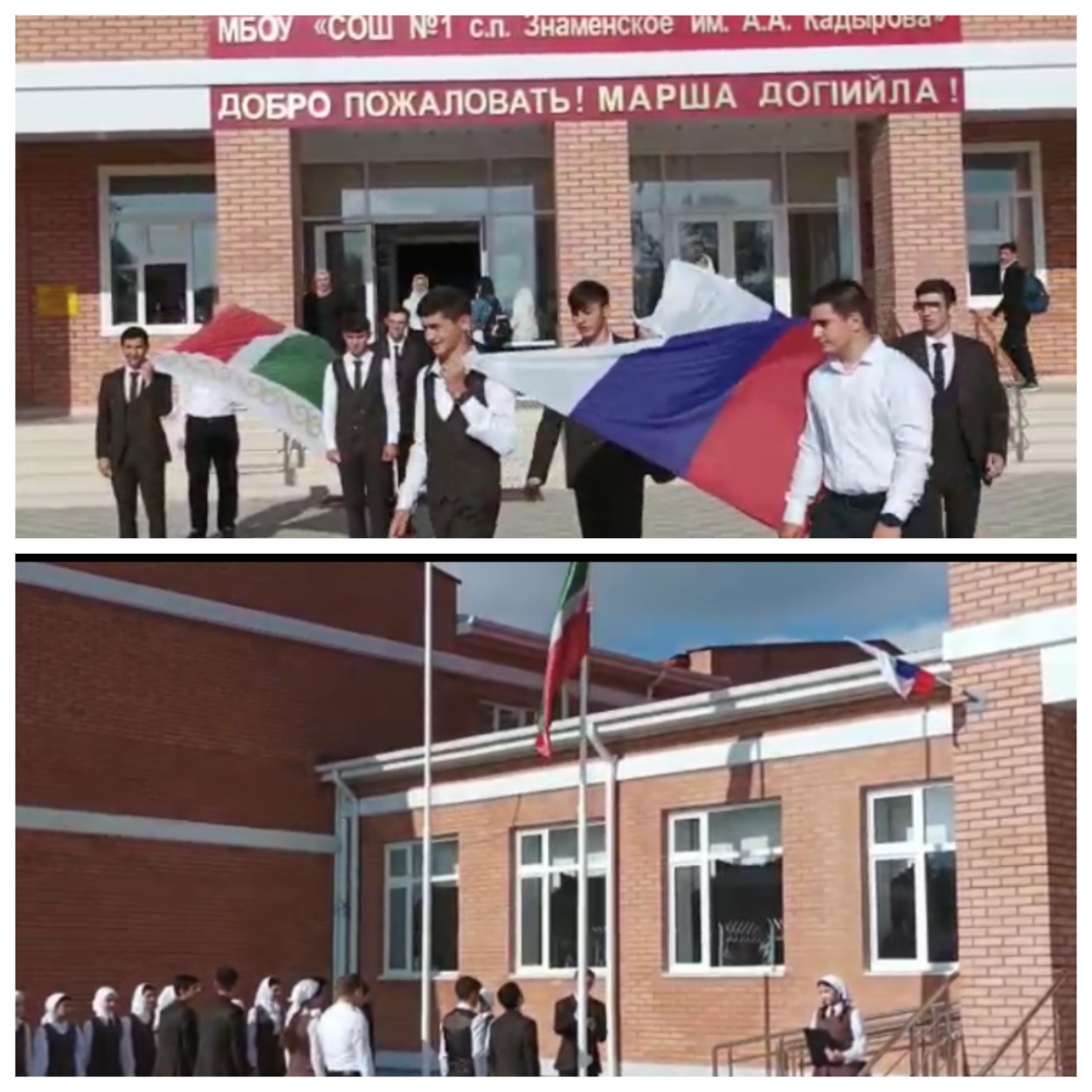 В рамках реализации Всероссийского цикла внеурочных занятий «Разговоры о важном» в МБОУ «СОШ№1 с.п.Знаменское им. А.А. Кадырова» 12.09.2022 года проведена общешкольная линейка торжественным поднятием флагов РФ и ЧР под исполнение гимнов РФ и ЧР.