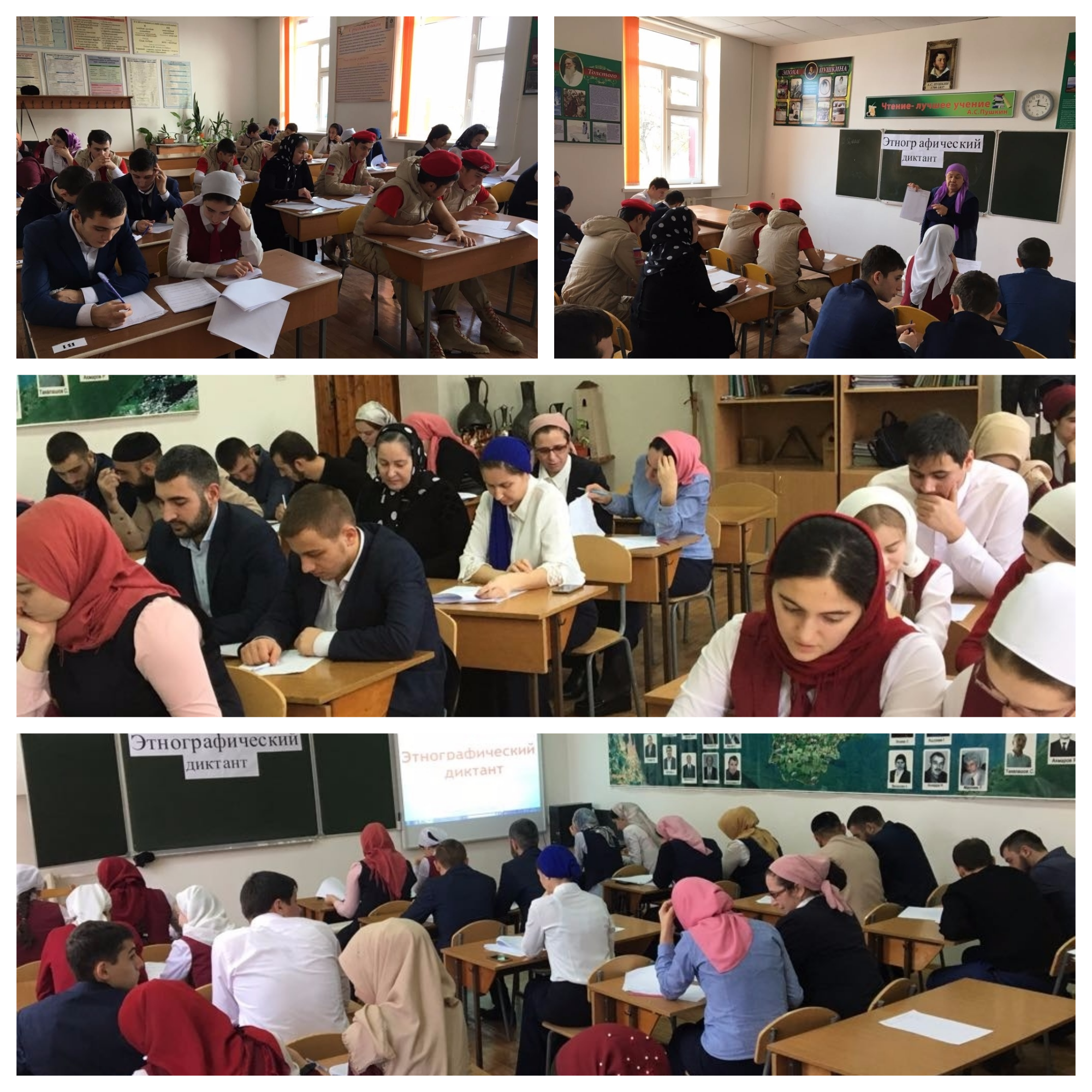 09.12.2017г. в 12:00 ч. в МБОУ СОШ 1 начался Республиканский этнографический диктант, с целью повышения уровня этнокультурной компетенции учащихся и учителей и мотиваций их к изучению этнографии, истории и культурологии как наук, занимающих важное местоположение в гармонизации личности. Текст диктанта включал в себя 100 тестовых заданий с вопросами по истории, географии и этнографии Чеченской Республики. В нашей школе участвовало в этнографическом диктанте 53 человека. Это учителя и учащиеся школы. А также вместе с нами приняла активное участие в этнограическом диктанте заместитель начальника РУО Надтеречного района Яхъяева Роза Ахмудовна, которая вместе со всеми участниками решала тестовые задания диктанта. Мероприятие прошло в дружеской, увлекательной и занимательной атмосфере, где все участники старались ответить как можно на большее количество вопросов и показать свою компетентность и заинтересованность в истории, культуре и этнографии чеченского народа.