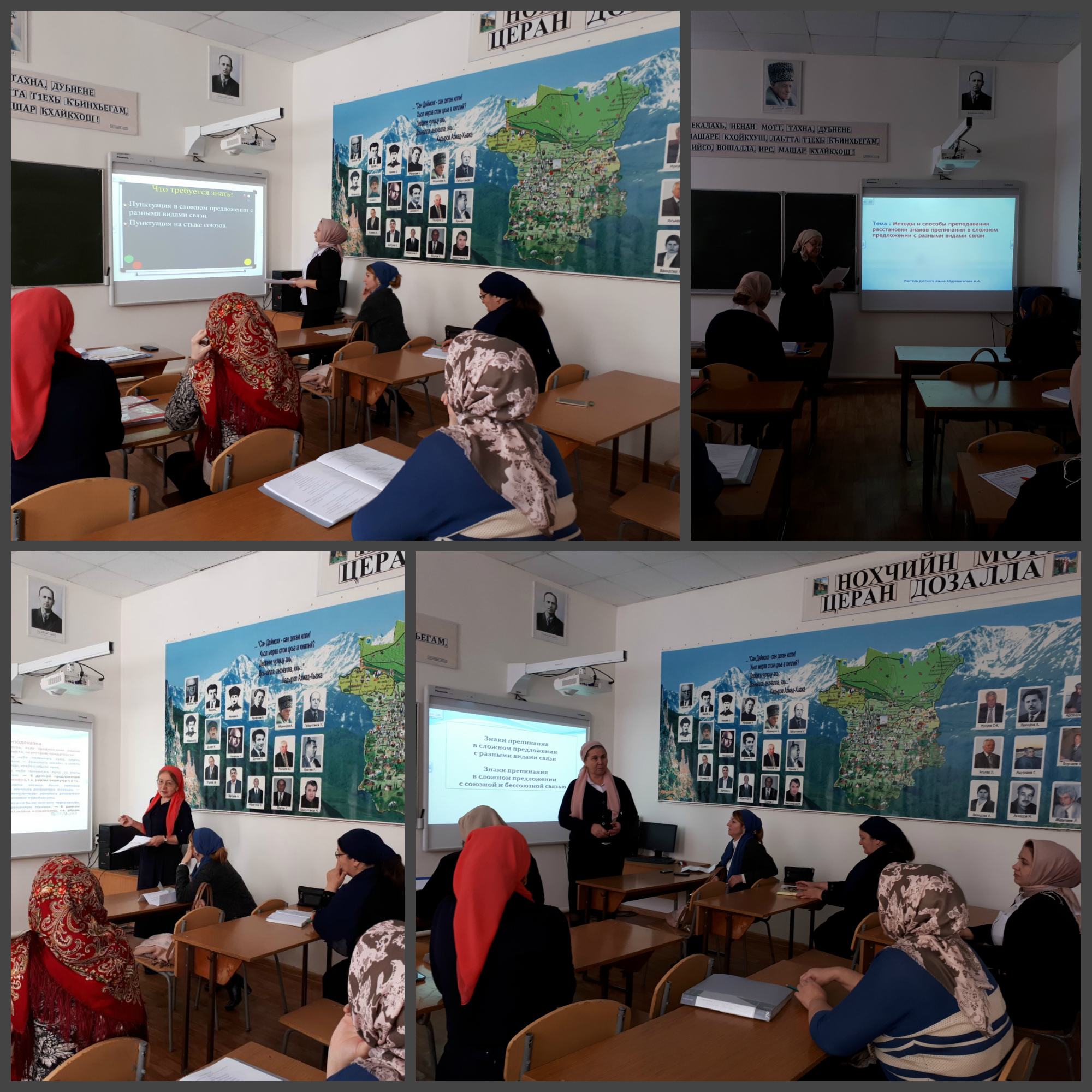 В ходе семинара Абдулвагапова А.А, Абдулвагапова М.М., Вахаева З.М. продемонстрировали выполнение заданий по вышеуказанным темам. Особый акцент был сделан на сложных предложениях с различными видами связи и расстановку знаков препинания в них. Далее была проведена отработка подобных заданий остальными учителями-предметниками. Большое внимание было уделено отработке заданий, связанных с пунктуацией, в формате ОГЭ и ЕГЭ. Учителями-предметниками были использованы презентации и сообщения по вышеуказанным темам.