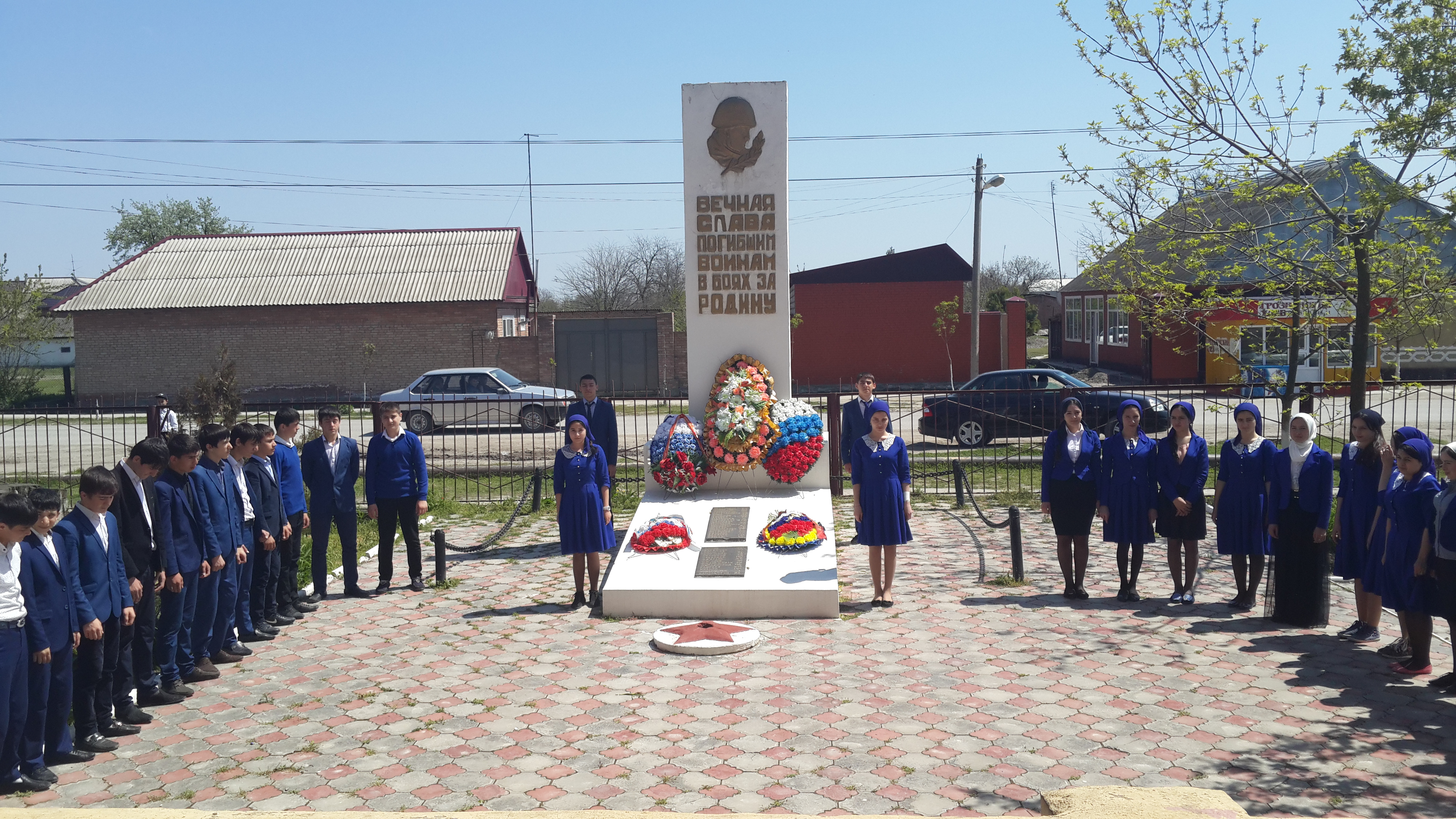 В целях воспитания патриотизма , верности Памяти погибшим воинам-защитникам родной земли, чувства гордости за воинов-соотечественников, приблизивших Великую Победу 25 апреля 2015г учащиеся 9-11-х классов МБОУ «СОШ №1 с.п.Знаменское» провели торжественное возложение венков к памятнику погибшим воинам Великой Отечественной войны.Возложение венков проходило в рамках республиканской акции «Дорога к обелиску», посвященной 70-летию Победы в Великой Отечественной войне 1941-1945гг. Мероприятие проходило в сопровождении песен военных лет и чтения стихотворений поэтов военных лет. Возложение венков закончилось Минутой молчания.