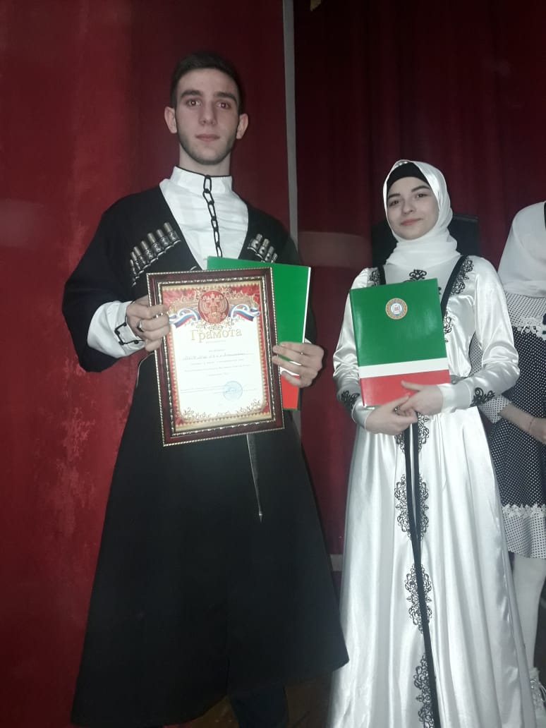 09.02.2019Обучающиеся МБОУ «СОШ№1 с.п. Знаменское», лидер команды «Форт «Вайнах» ЕДЮО «Юные Кадыровцы» им. Первого Президента, Героя России А.-Х. Кадырова Умеев Магомед-Хан, ученик 10А класса и участница вокально-хореографической группы «Синтар» Умарова Селима, ученица 9А класса заняли 1 место в муниципальном этапе республиканского конкурса - фестиваля «Золотой голос» в номинации «Дуэт».